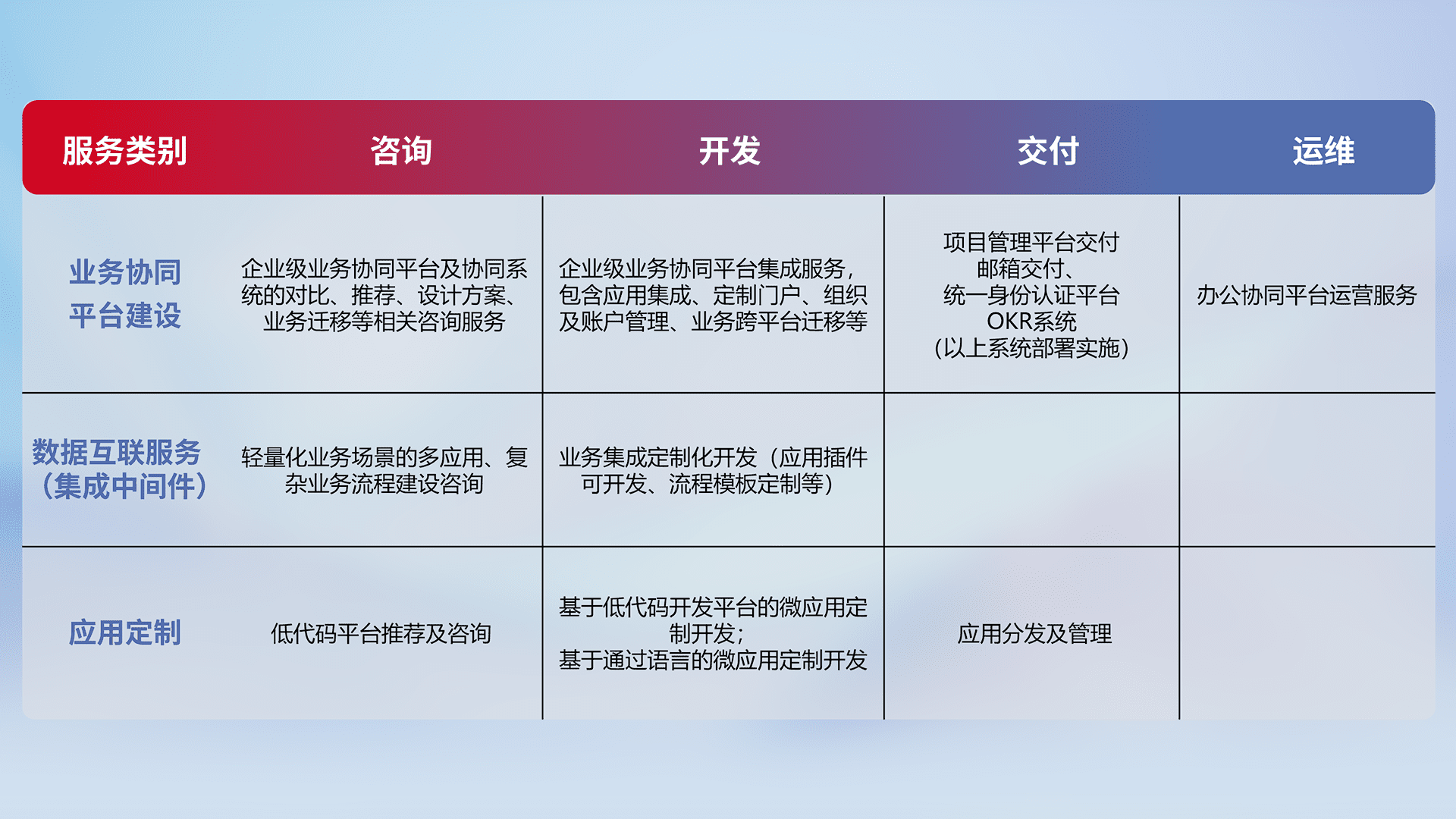 针对钉钉、、、企微、、、IDaas等平台级产品提供产品的规划、、、方案、、交付、、定制化开发等服务,,,,实现如统一协同办公、、智能客户服务、、、混合会议管理、、智能数据查询、、、、等业务场景,,,实现数字化转型。。。。